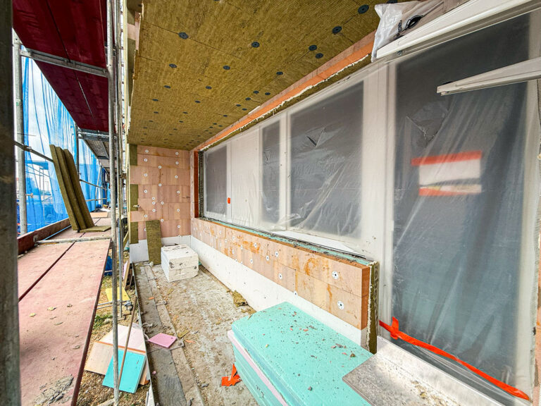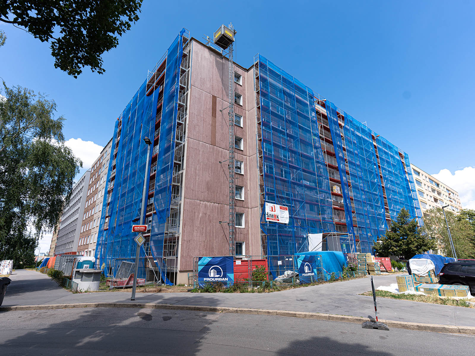 Část domu je osazena lešením a pracujeme na rekonstrukci lodžií. Je demontované betonové zábradlí a začínáme se zateplením.
